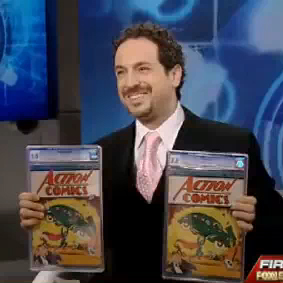 Vincent Zurzolo, Co-owner and COO of Comic Connect shows off the million-dollar comic and brings along his lowly friend, another copy of Action Comics #1 with a lower grade and a much lower price tag. Thrifty bastards, here’s your chance to own your very own copy!